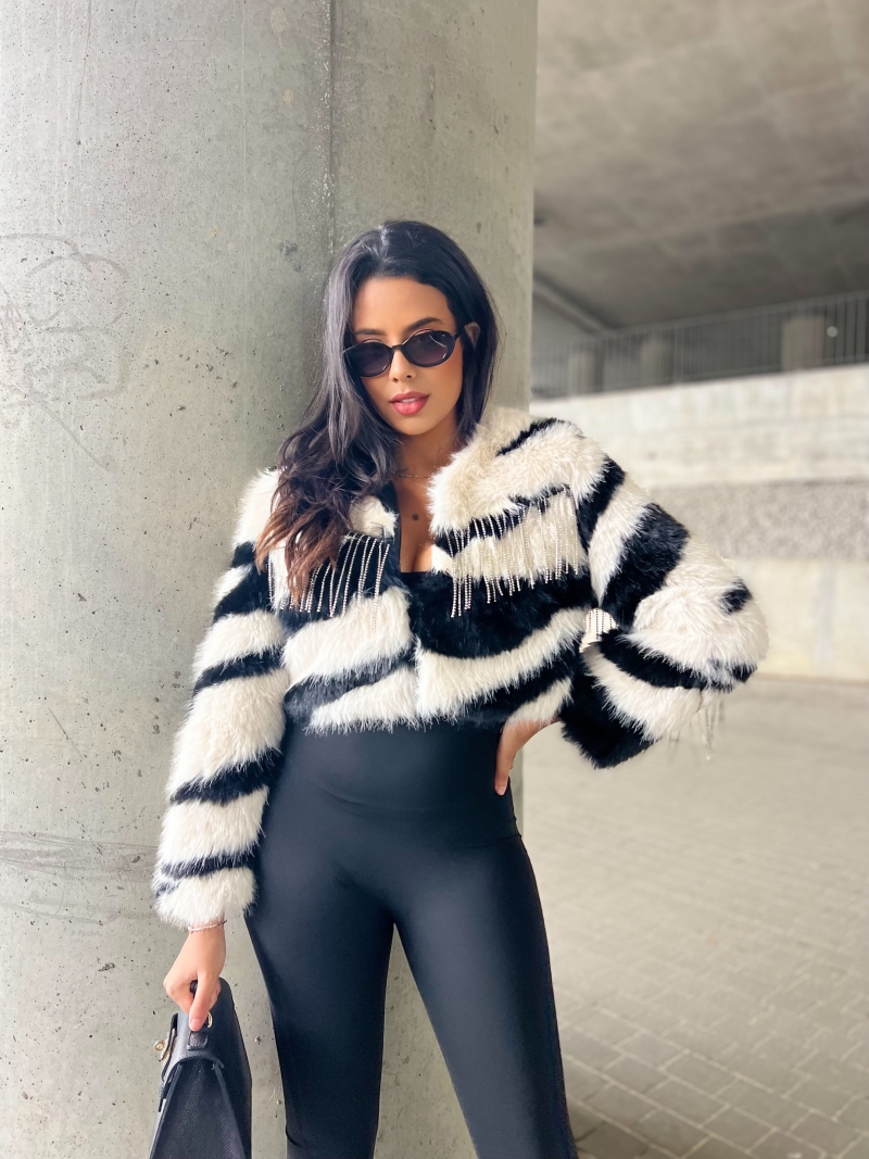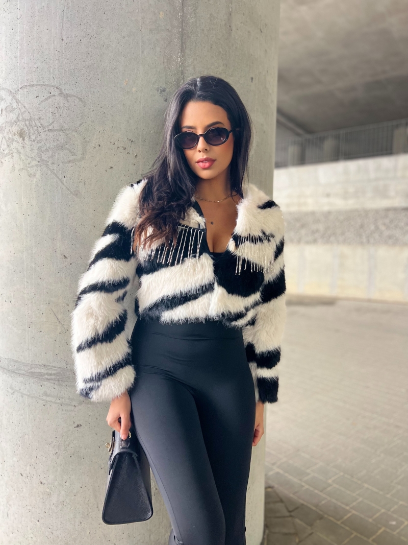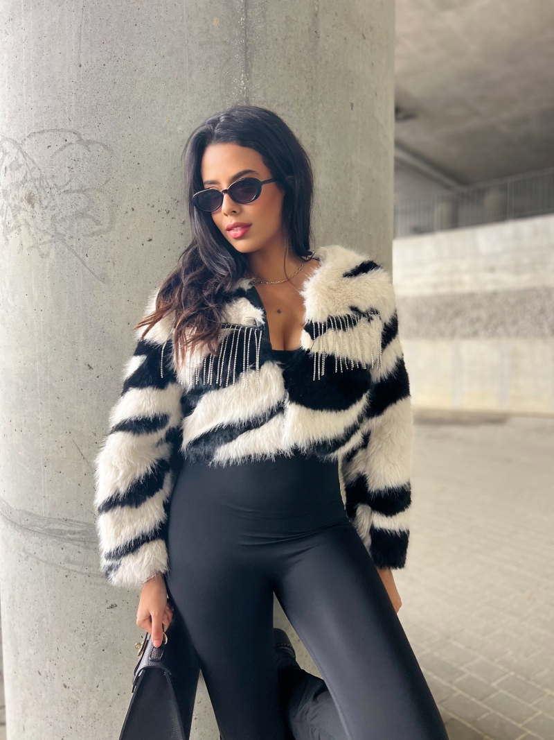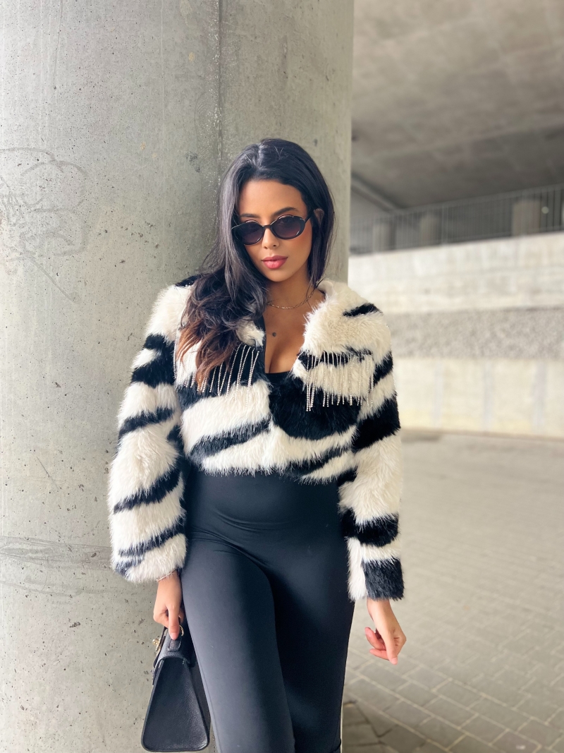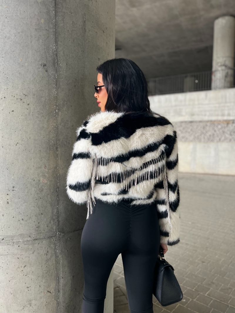 Odkryj naszą wyjątkową krótką kurtkę w formie futerka z dżetami – idealną na każdą okazję! To stylowe futerko z frędzlami doda blasku Twoim outfitom, a sztuczne futro zapewni komfort i ciepło. Doskonała jako narzutka, sprawdzi się zarówno na co dzień, jak i na wieczorne wyjścia.