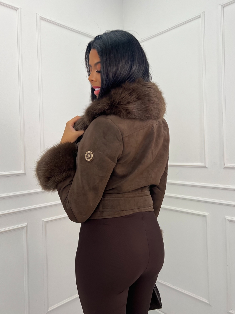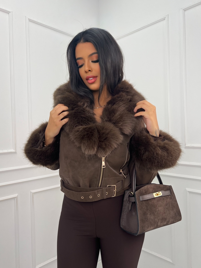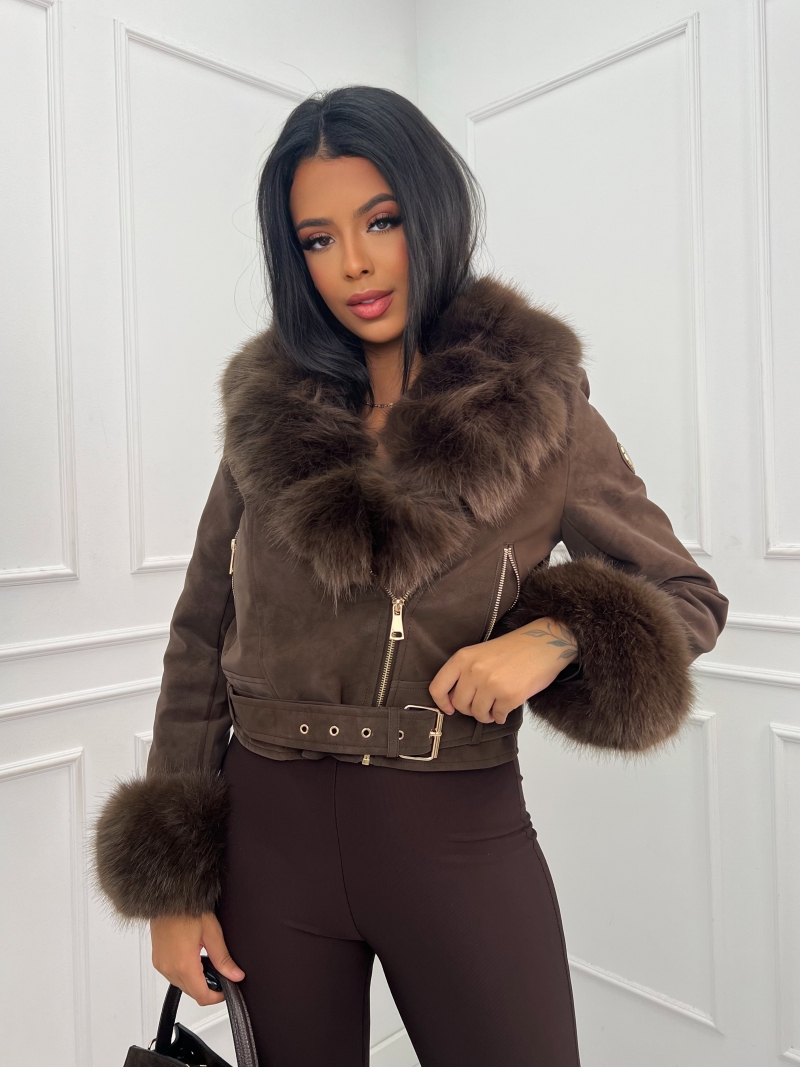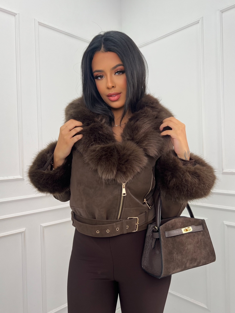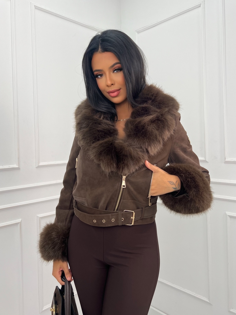 Kurtka ramoneska miękka skóra z futrem czekolada Hazel – elegancja, komfort i styl w jednym!