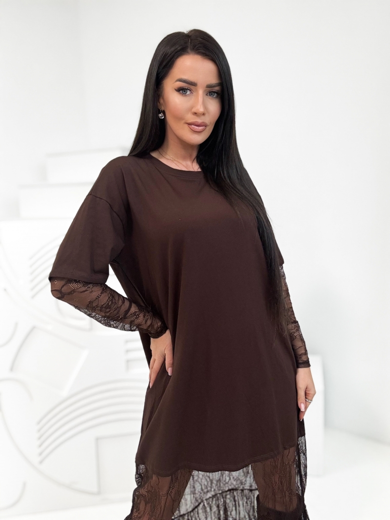 Sukienka maxi z koronką Lorenzo – Elegancja w każdej chwili! Sukienka maxi z koronką Lorenzo – hit sezonu, który zachwyci Cię swoją oryginalnością! Ta oversizowa sukienka w formie T-shirtu z delikatnymi wstawkami z koronki to doskonały wybór na każdą okazję. Okrągły dekolt pod szyję sprawia, że jest nie tylko modna, ale i niezwykle wygodna.
