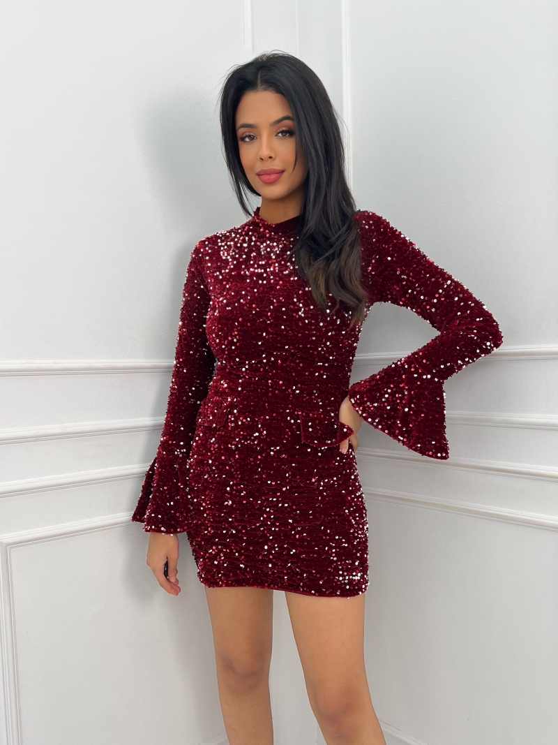 Sukienka welurowa z cekinami i rozkloszowanym rękawem bordowa Harriet