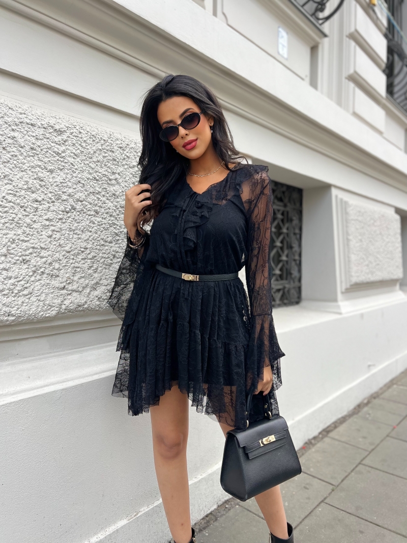 Sukienka koronkowa z żabotem i falbanami Linzi – elegancja w każdym detalu!