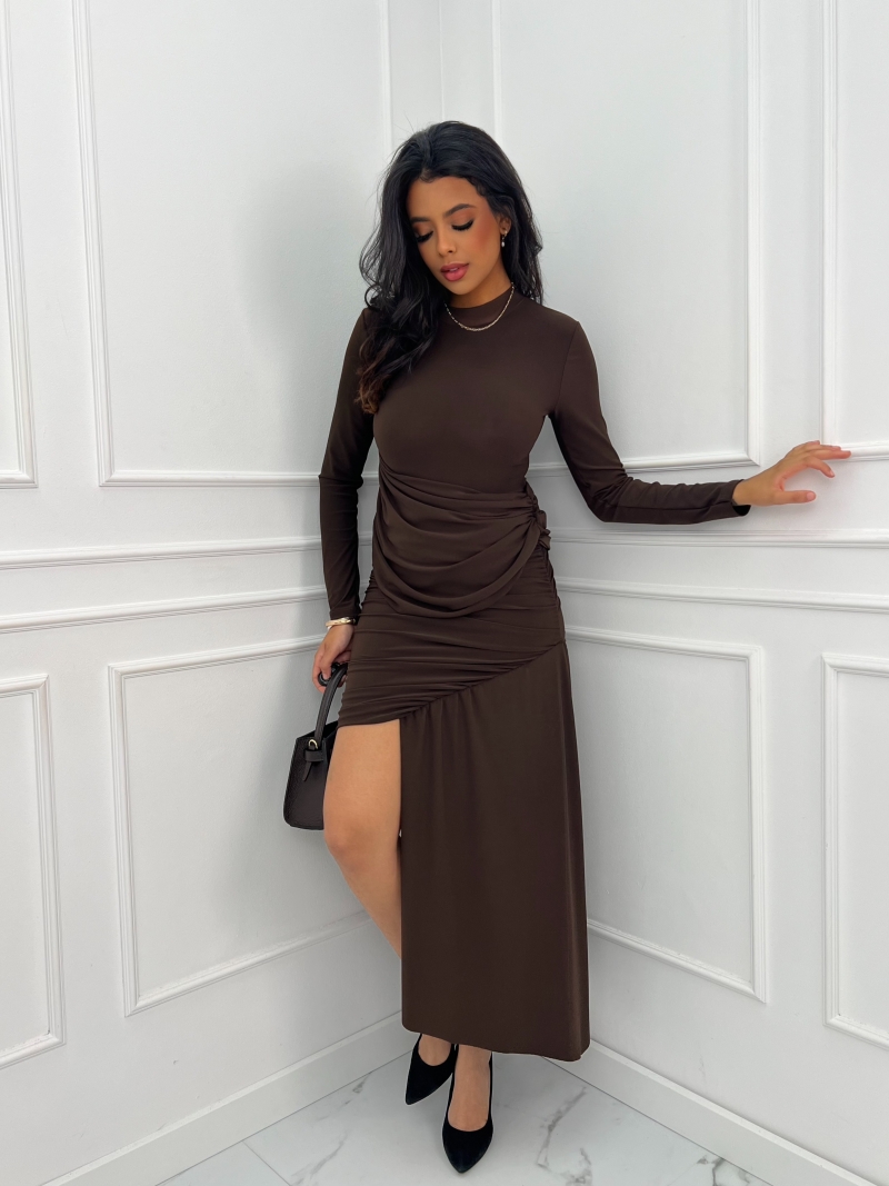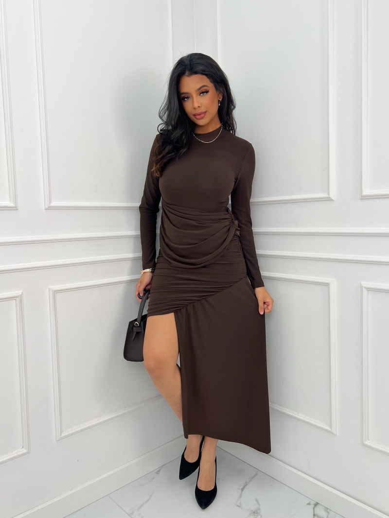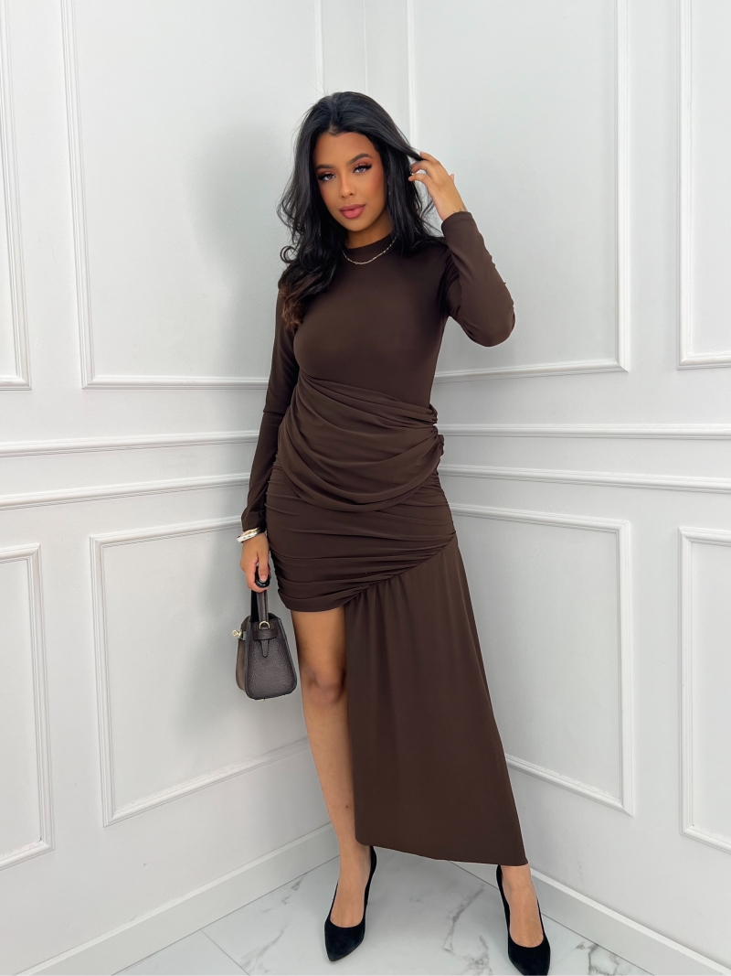 Odkryj magię elegancji i komfortu dzięki naszej sukience maxi z marszczeniem czekolada Nell. To idealny wybór na każdą okazję – od romantycznych randek po wyjątkowe przyjęcia. Dzięki unikalnemu designowi i starannie dobranym detalom, poczujesz się pewnie i kobieco.
