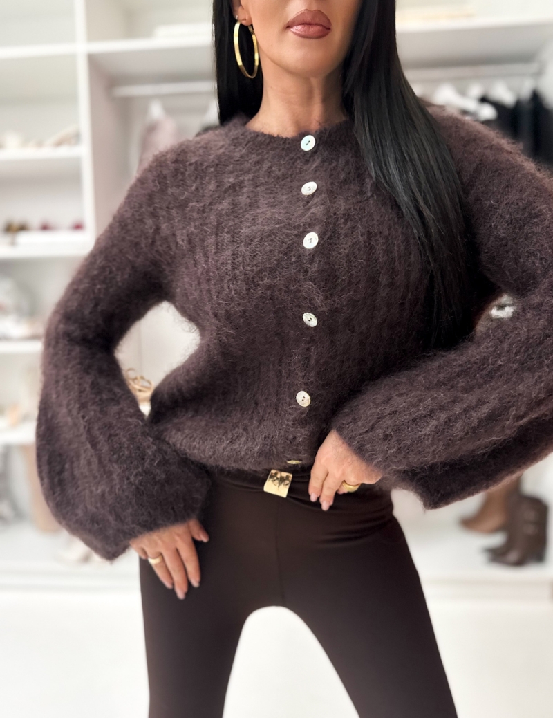 Sweterek moherowy na guzki z dzwonkowymi rękawami – Twoja tajna broń na każdą okazję! Wykonany z delikatnego moheru, ten sweterek otuli Cię miękkością i ciepłem, sprawiając, że każda chwila stanie się przyjemnością.
