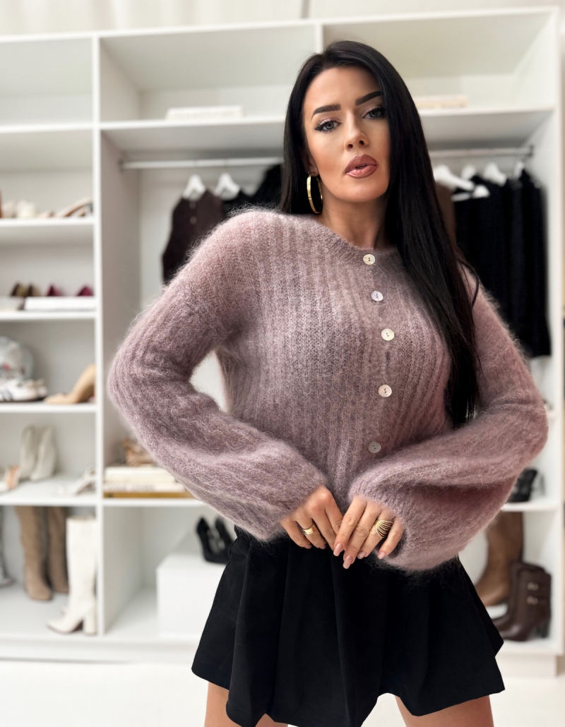 Sweterek moherowy na guzki z dzwonkowymi rękawami – Twoja tajna broń na każdą okazję! Wykonany z delikatnego moheru, ten sweterek otuli Cię miękkością i ciepłem, sprawiając, że każda chwila stanie się przyjemnością.